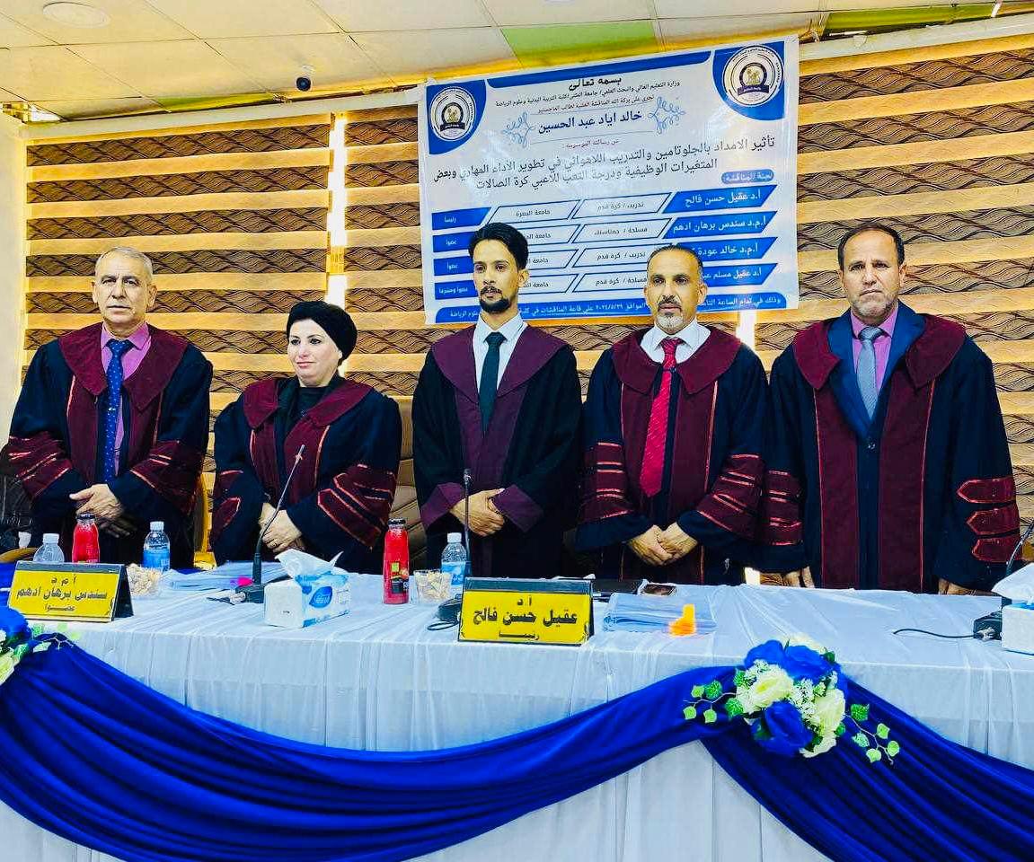 03/06/2024جرت على قاعة المناقشات لكلية التربية البدنية وعلوم الرياضة / جامعة المثنى رسالة الماجستير للطالب (خالد اياد عبد الحسين) الموسومة (تاثير الامداد بالجلوتامين والتدريب اللاهوائي في تطوير الأداء المهارى وبعض المتغيرات الوظيفية ودرجة التعب للاعبي كرة الصالات)