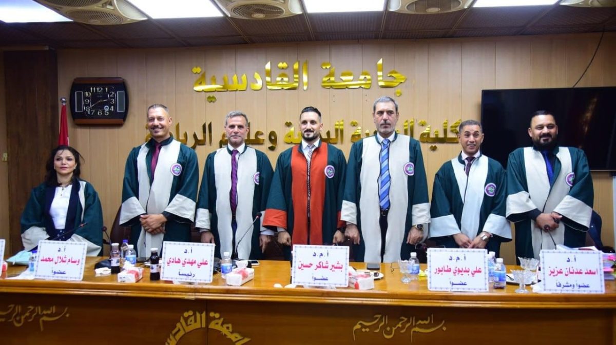 تدريسي يشارك في لجنة مناقشة علمية لأطروحة الدكتوراة في جامعة القادسية/ كلية التربية البدنية وعلوم الرياضة