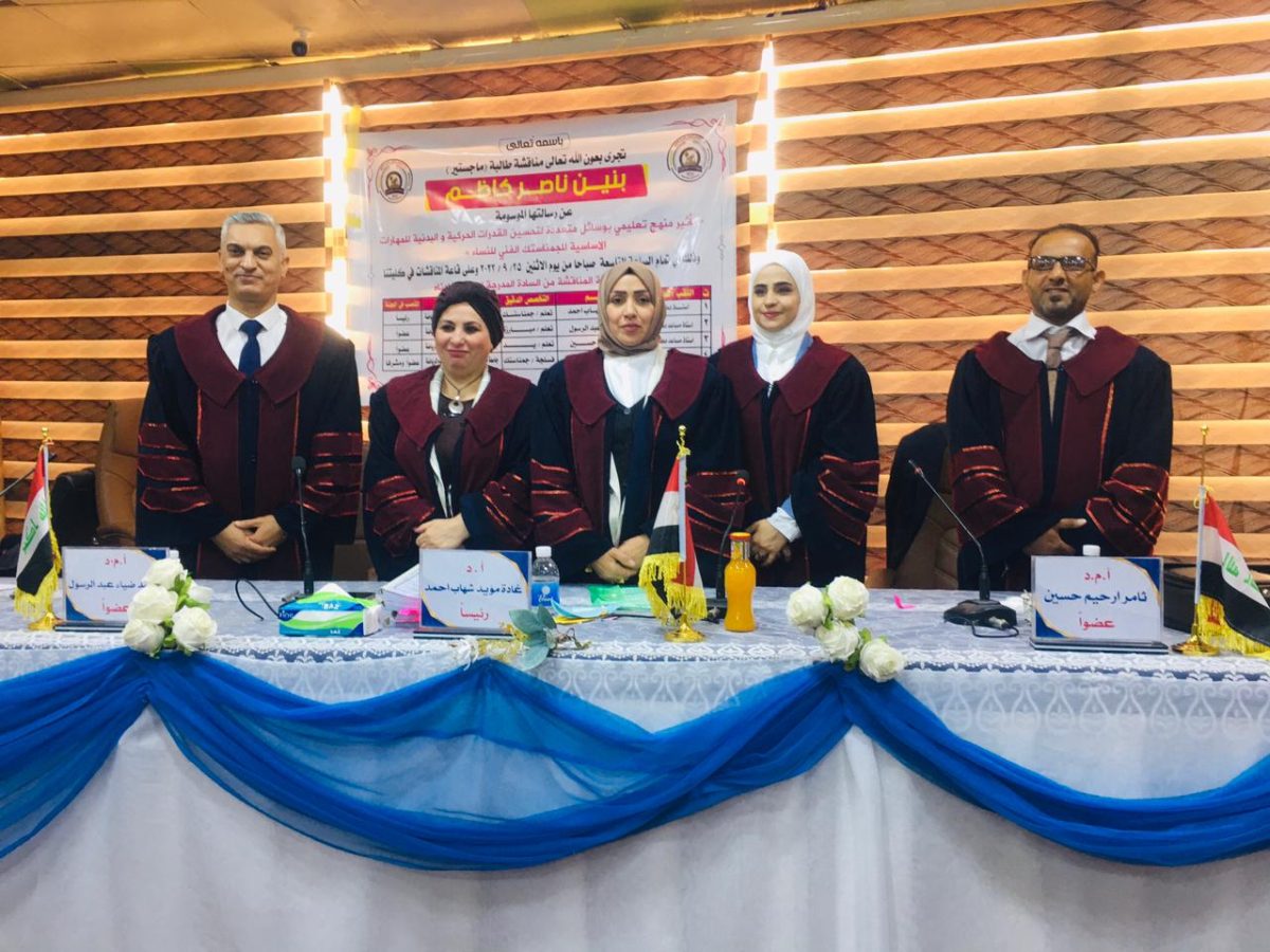 ناقشة رسالة ماجستير في جامعة المثنى – كلية التربية البدنية و علوم الرياضة بعنوان(تاثير منهج تعليمي بوسائل متعددة لتحسين القدرة الحركية و البدنية للمهارات الاساسية للجمناستك الفني للنساء)